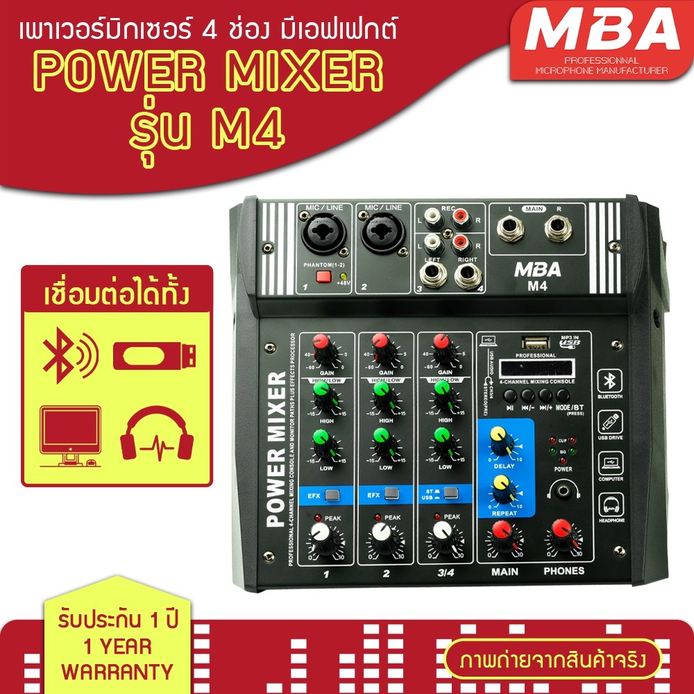 MBAAUDIOTHAILAND POWER MIXER รุ่น M4 เพาเวอร์มิกเซอร์ 4 ช่อง MBA มีเอฟเฟกต์ รับประกัน 1 ปี คลิกที่นี่ >>